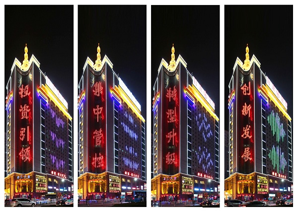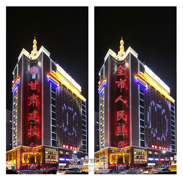在美輪美奐、閃爍變換的燈光下,“甘肅建投向全市人民拜年和‘投資引領(lǐng)、集中管控、轉(zhuǎn)型升級(jí)、創(chuàng)新發(fā)展’十六字企業(yè)發(fā)展戰(zhàn)略,展示了甘肅建投精英匯聚,扶搖直上的現(xiàn)代企業(yè)精神理念,腳踏實(shí)地、努力拼搏的企業(yè)本色。這種將傳統(tǒng)工藝與現(xiàn)代高科技手段相結(jié)合的設(shè)計(jì)方案,不僅體現(xiàn)出甘肅建投蓬勃向上,積極創(chuàng)新的企業(yè)精神,也使建工大廈成為區(qū)域內(nèi)具有獨(dú)特魅力的標(biāo)志性建筑。